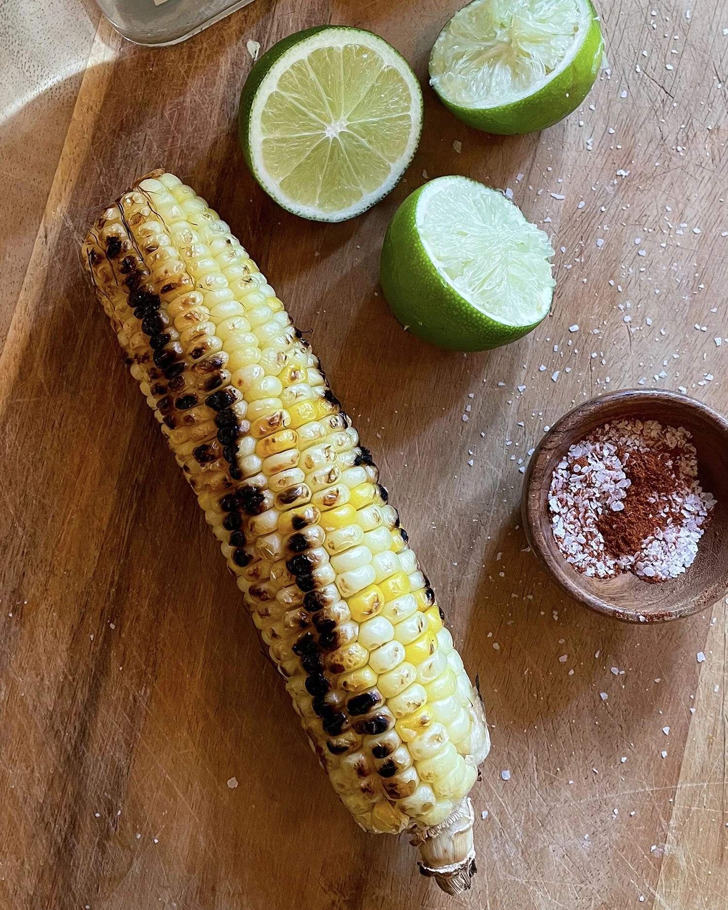 Grill your ear of corn on the BBQ or in a pan on the stovetop over medium-high heat. Let it grill to a nice char, and then rotate it every minute or so so that it gets that char on each side. Set aside to cool.